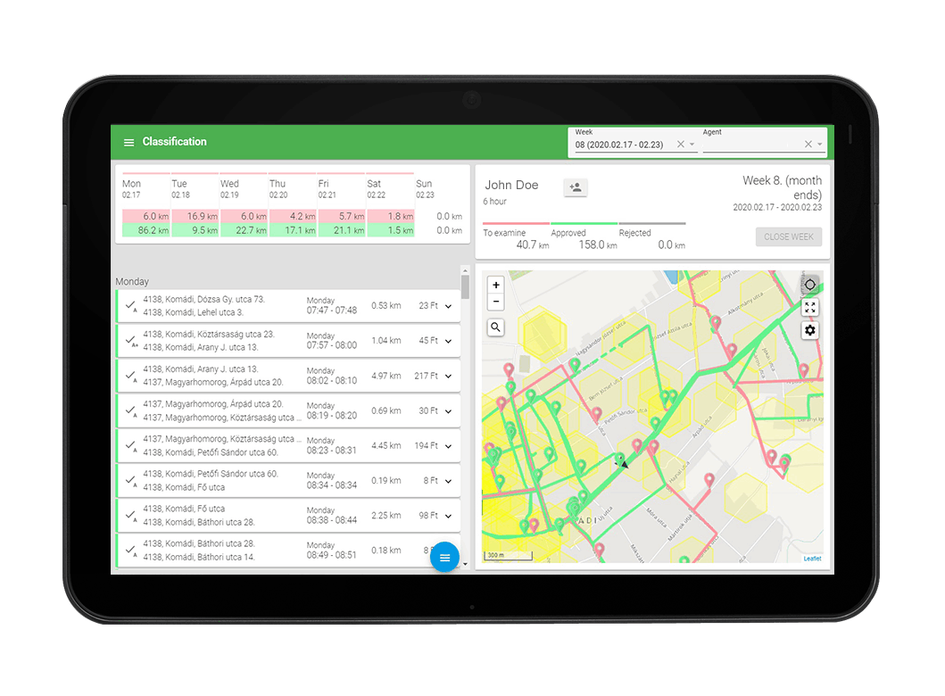 Egyedi, szabályrendszer alapú útvonalelszámolás és munkaidő kimutatások.